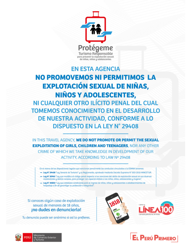 En el siguiente link se encuentra el Código de Conducta contra la explotación sexual de niños, niñas y adolescentes (ESNNA) en el ámbito del Turismo, que nuestra empresa suscribe y se compromete a cumplir a cabalidad.